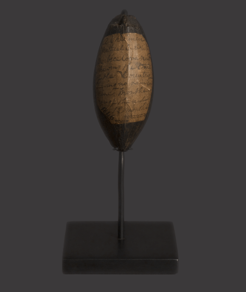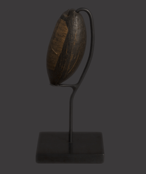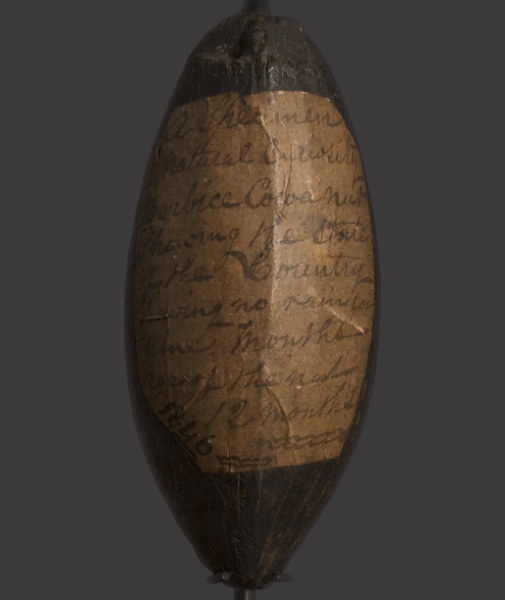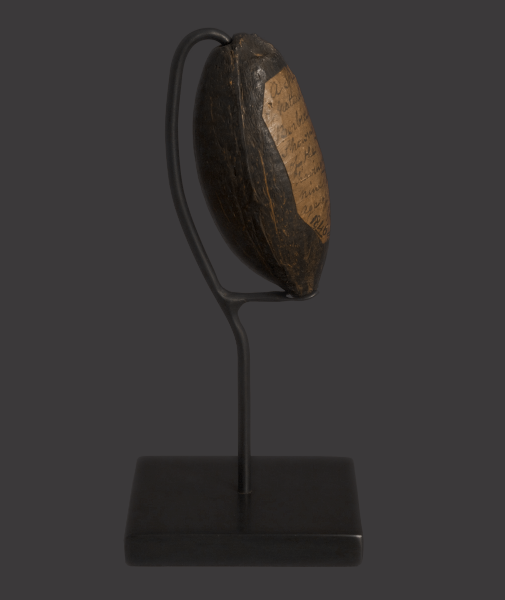 ”A specimen of natural curiosity, Berbice Cocoanut showing the state of the country having no rain for nine months, age of the nut 12 months, 1846”.