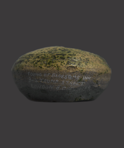 This money box was almost certainly produced at the Kingston-upon-Thames site and can therefore, (although still belonging to the Surrey Whiteware group), be more accurately termed as ‘Kingston-type ware’. It was discovered in London in 1955 during excavations at ‘Blossoms Inn’, 3-4 Trump Street EC2 and is marked accordingly. A small portion has been removed from the top, enlarging the original slit opening, facilitating access to the contents, a common and understandable process of vandalism which most unusually, in this instance, has fortunately left the moneybox remarkably intact.