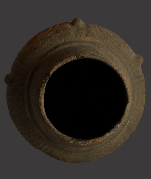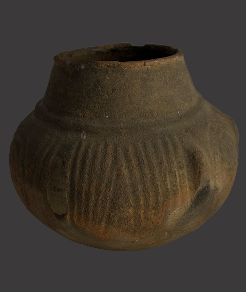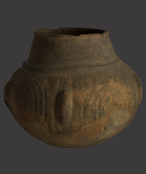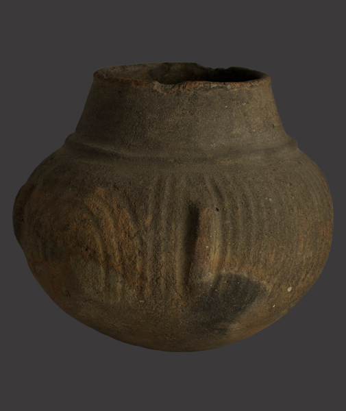 The thick walled bulbous body of this large, complete urn served to contain a deceased individuals cremated remains and as part of pagan ritual was subsequently buried, probably alongside accoutrement’s or personal possessions known as ‘Grave Goods’. The urn is decorated with a series of grooved, linear designs, these are divided from one another by raised lobes, (of which three remain), which serve to form five separate compartments. Three of these compartments repeat an arch design consisting of three concentric grooves. the two remaining compartments contain a wall or barrier formed from repetitive vertical lines, one is consistent, veil like and closed, the other revealing a central opening, usually interpreted to represent female genitalia, cleverly conveying and symbolising the suggestion of re-birth or the entering of another world.