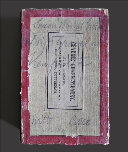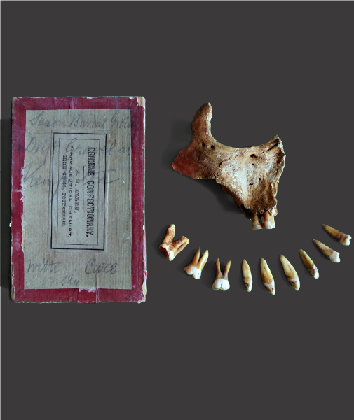 This particularly emotive small box contains 11 teeth, (9 detached, 2 in-situ) and the partial skull, (right eye socket/upper jaw), of an individual whose remains were discovered and saved during the 19th Century gravel extractions. The lid of the box is handwritten with the particulars of provenance, ‘Saxon Burial Ground, in Drift Gravel at Kempston, with care’.