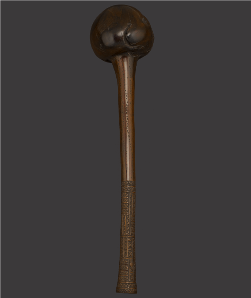 This superb ball-headed example, (‘Ula drisia’), displays a complex dotted tally system trailing the shaft, recording multiple “kills” or important ceremonial events. Of note is the unusual symbolic decoration to the very well carved handgrip.