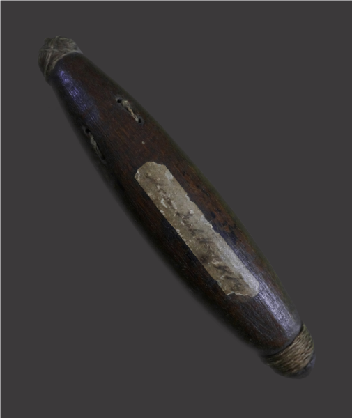 This large early trolling lure is a truly superb example, with well formed barbed bone hook and muka binding, the Paua shell inlay to in-curve, perfect for enticing large predatory fish with its natural reflective qualities when dragged through the ocean. An old collection label to the reverse of the fine wooden body, marked in handwritten ink, ‘Maori Fish Hook, 15 July’