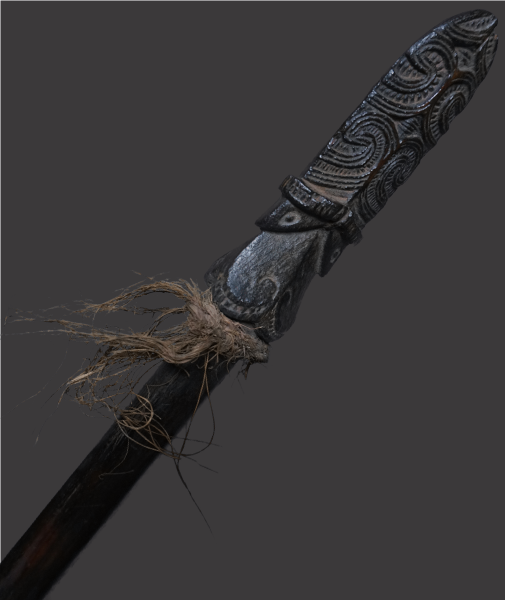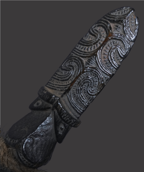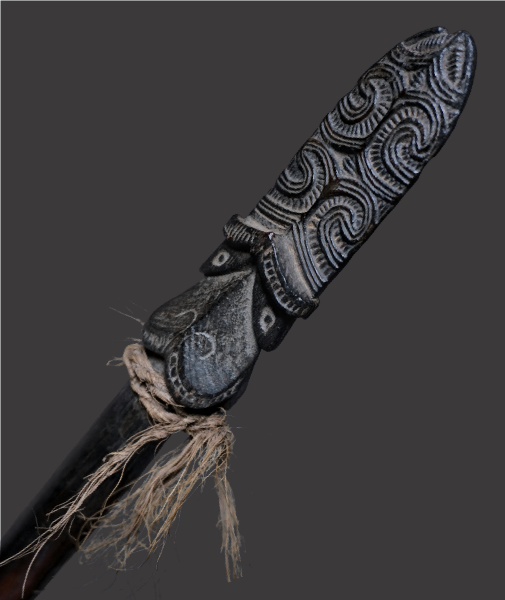 A formidable weapon in the hands of the Maori warriors of New Zealand, (‘Aotearoa’), the ‘Taiaha’, was used in close quarter, hand to hand combat. This wooden fighting staff was one of their most well known instruments of war, often mistakenly described as a spear due to its appearance, it was not designed for throwing, but being held in both hands, the pointed tongue end, (‘arero’) was used to attack an opponent with a thrusting motion, the flat blade like end for striking. Maori warriors, (‘toa’), were well versed in its use, training for years to master the art of fighting with weapons, (‘Mau rakau’).