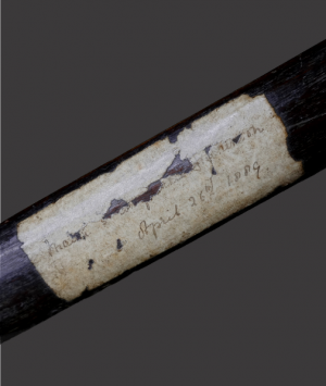 This wonderful example is beautifully worn and marked from much handling and obvious long period of use, it displays a fine dark patina and retains some of its original fibre binding. An old collection label affixed to the shaft, marked in handwritten ink, ‘Maori…….(the next few words now somewhat illegible)……on April 26th 1889’.