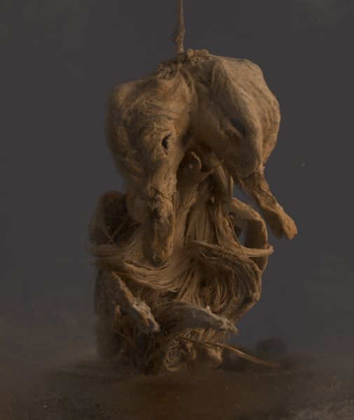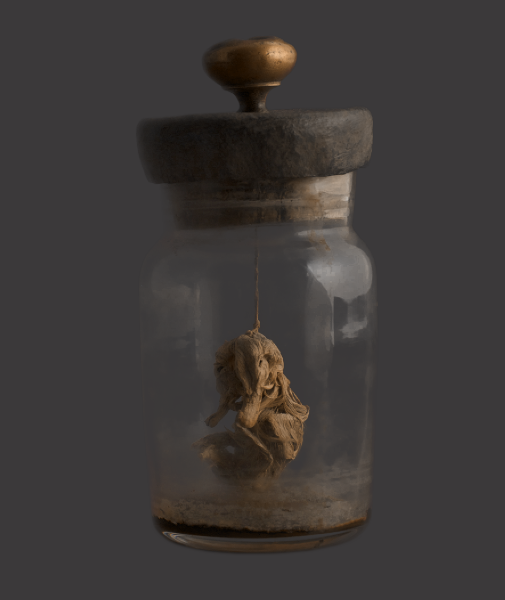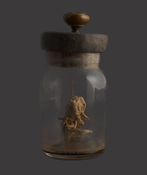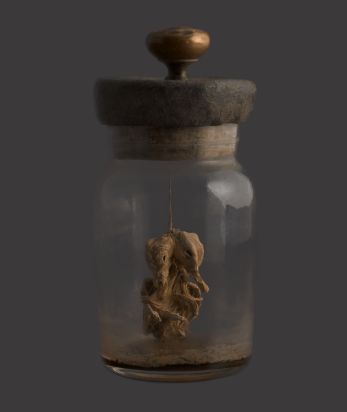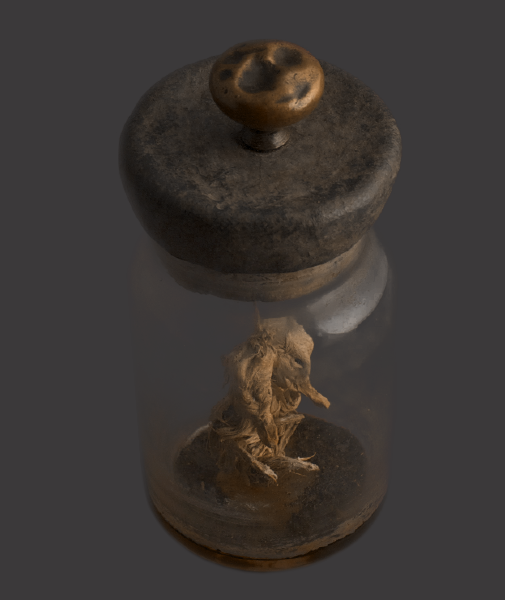 This extraordinary and very rare specimen was originally conserved by suspension in fluid. Now long evaporated, it has resulted in this example being wonderfully preserved in a mummified state with the fluids concentrated residue evidenced at the base of its original glass jar.