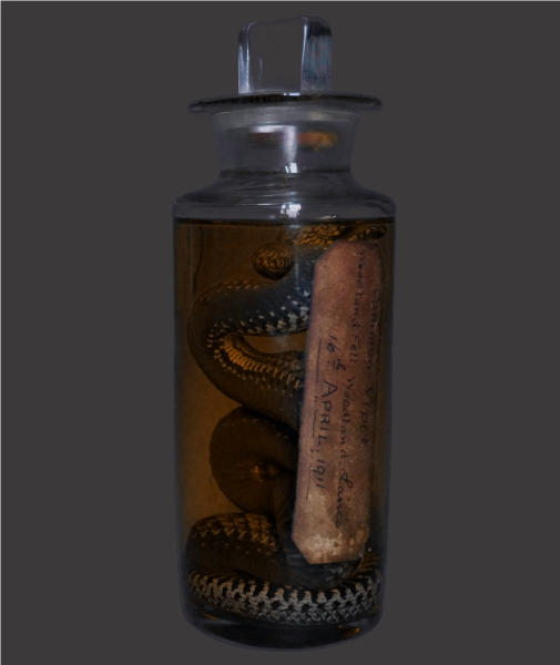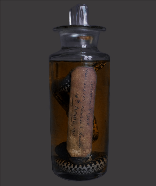 This beautifully preserved Common Viper snake specimen, ‘Vipera Berus’, also commonly referred to as an Adder, (deriving from an old English word meaning serpent), was discovered in Woodland Fell, Lancashire on 16th April 1911 and has been annotated accordingly. It is Britain’s only venomous snake and the species is deeply rooted in the ancient folklore and religion of the country.