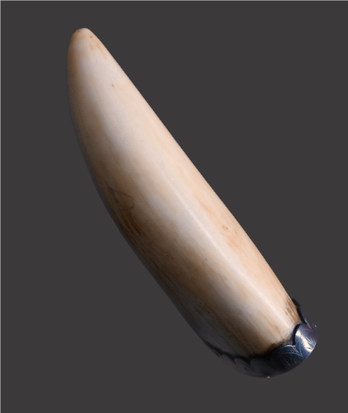 The most prized material of the ‘Scrimshander’, the dense tooth of the Sperm Whale was selected as the primary choice for producing many of the finest works and components of. It is perhaps however the teeth which remain in their original form which are the most compelling and instantly recognisable of the works produced. Decorated with scenes and subject matter as various as the level of skill possessed by the carvers, no other single object epitomises the scrimshaw industry better. Those of artistic competence were free to create and perhaps record from, ‘life’, while individuals less gifted could paste a printed paper image sourced from a book to the tooth and carefully prick the outlines, which after removal of the paper allowed them to complete the design with carefully incising, joining the dots. Completed images would be highlighted with whatever was available to hand, ink, paint, tar, soot and even tobacco juice is believed to have been used.