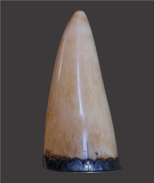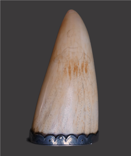 This superb early 19th Century silver mounted Sperm Whale tooth has been decorated with the rather emotive likeness of a female, almost certainly representing a loved one dressed in typical costume of the period. Its beautifully worn, deeply patinated surfaces demonstrate a long period of use and display the admirable colour and lustre one would associate and expect from such a tactile, prized possession, achieved by protracted human contact.